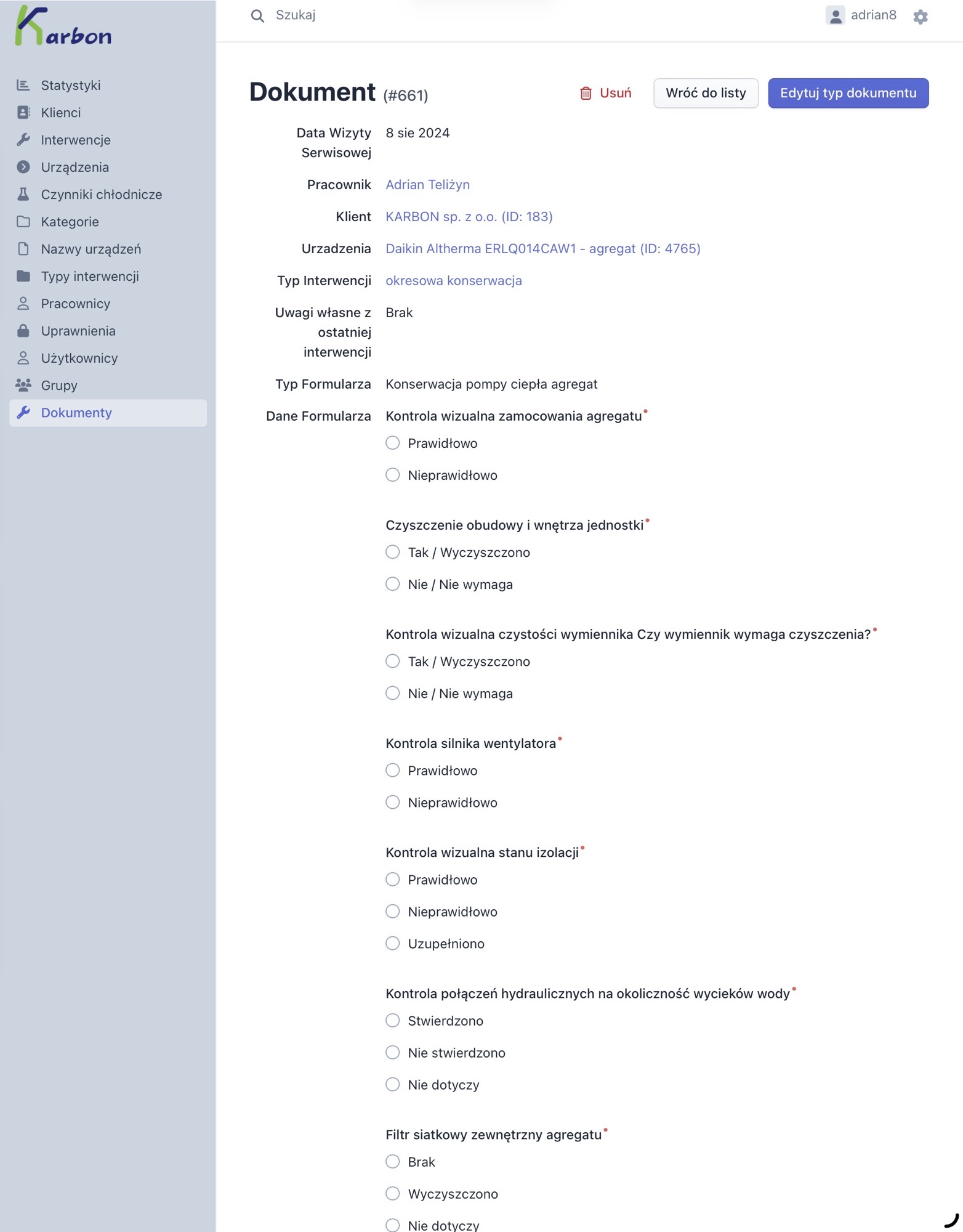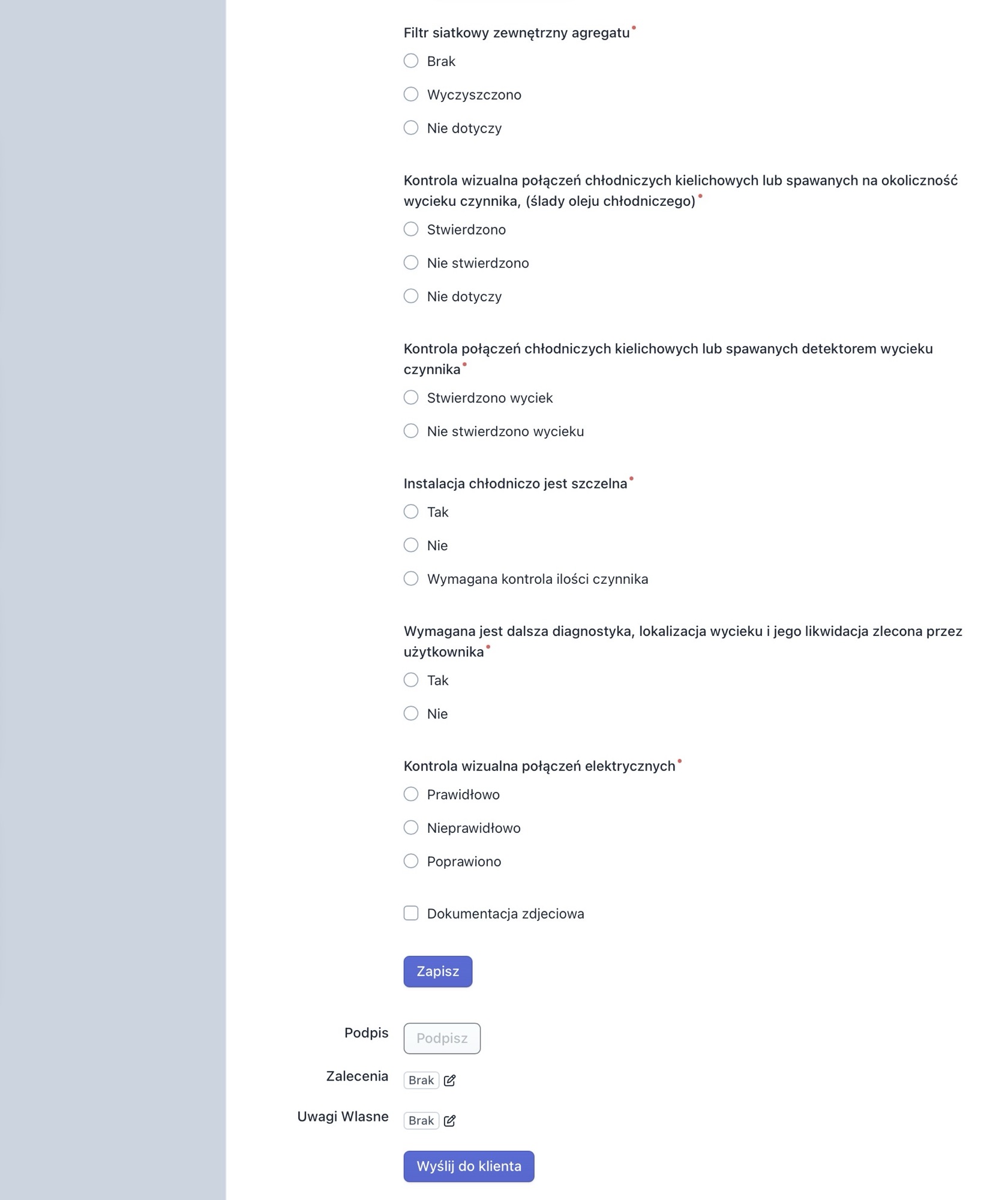 Następnie technik przystępuje do czynności serwisowych i wypełnia formularz.