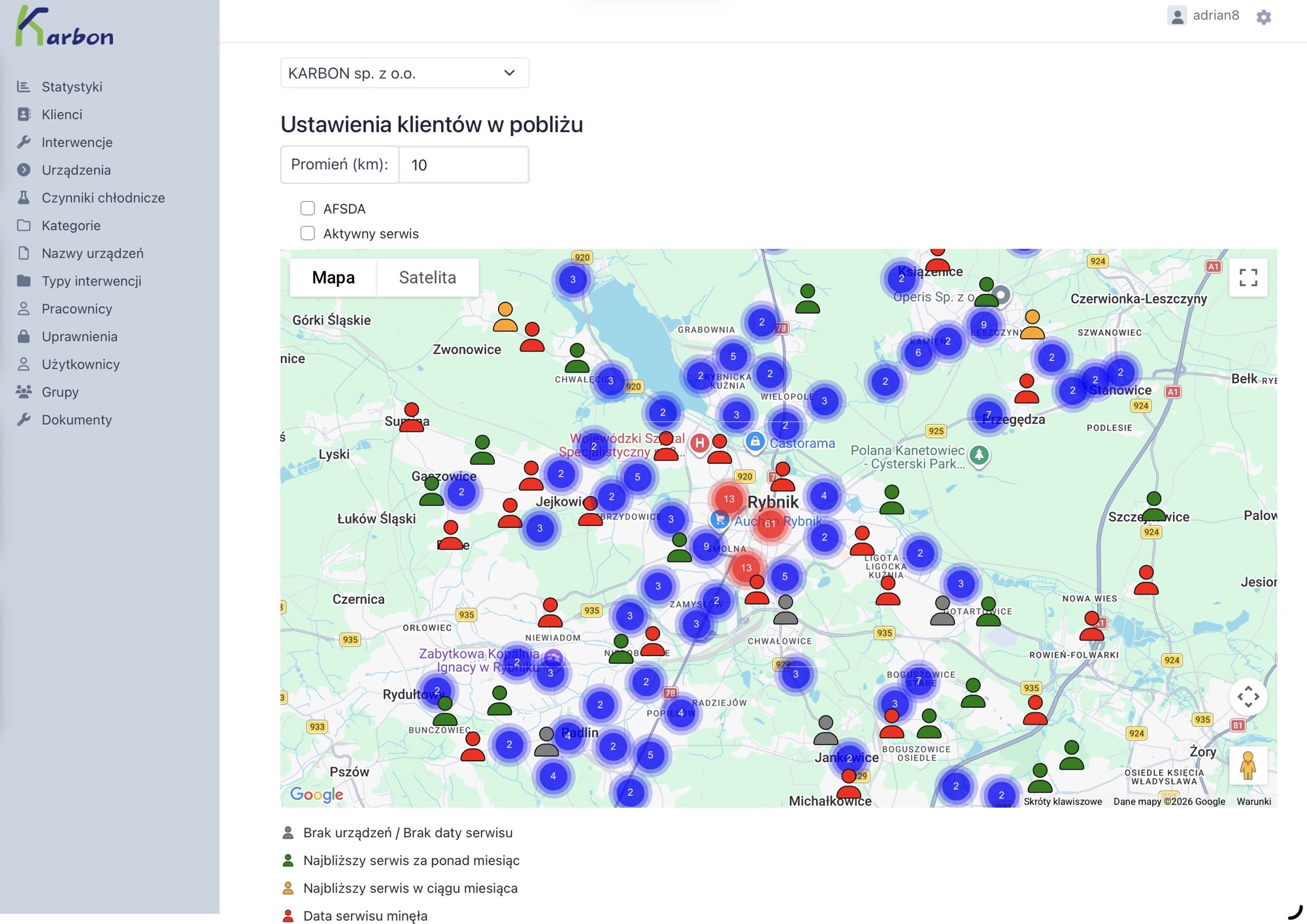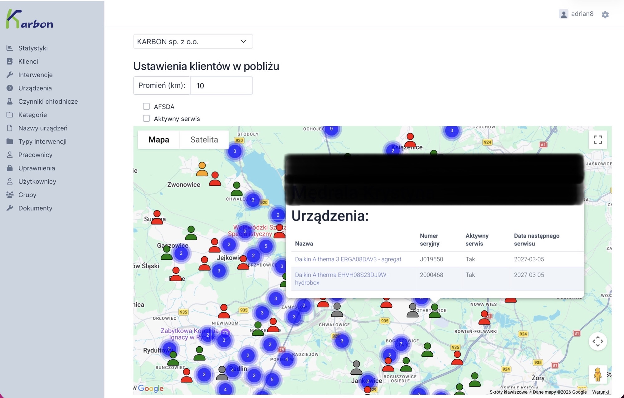 Po wpisaniu konkretnego klienta i ustaleniu zasięgu w km, dostajemy mapę klientów/urządzeń z wyznaczonym podziałem, np. komu minął już termin, kto ma go w najbliższym miesiącu czy dwóch, a kto jeszcze może poczekać.